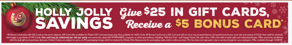 Buy a $25 99 Restaurant & Pub gift card and get a $5 bonus card free