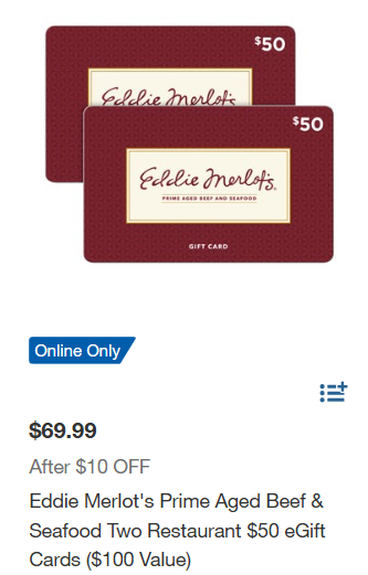 One Comment on “Costco.com: 30% Off $100 Eddie Merlot’s Prime Aged Beef & Seafood Gift Cards”