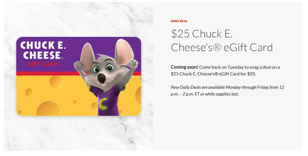- New deals offered weekdays 12 p.m. – 2 p.m. ET or while supplies last