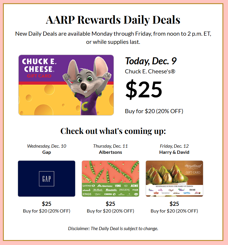 AARP membership is open to anyone 18 or older. Savings from daily deals alone can offset the cost of AARP membership fairly quickly for most people who participate in them, even before considering other discounts and benefits. Note that paid membership includes two separate accounts, each with its own gift card purchasing limits.