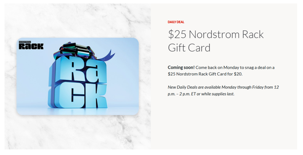 - New deals offered weekdays 12 p.m. – 2 p.m. ET or while supplies last