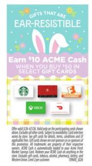 Earn $10 Acme Cash when you buy $50 in the following gift cards:
