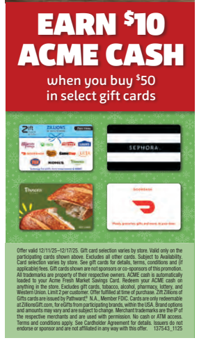 Earn $10 Acme Cash when you buy $50 in the following gift cards:
