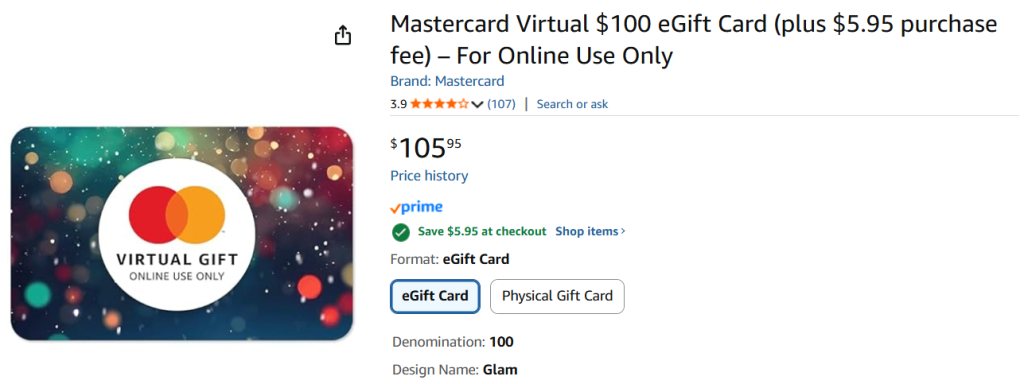 Mastercard Virtual $100 eGift Card (plus $5.95 purchase fee) – For Online Use Only