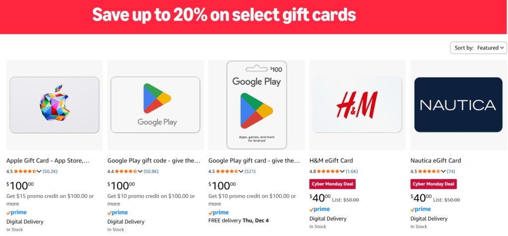 Amazon: Up to 20% Off Select Gift Cards (Cyber Monday)