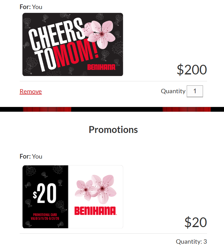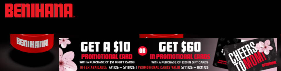 Get a $10 promotional card with a purchase of $50 in gift cards or get $60 in promotional cards with a purchase of $200 in gift cards