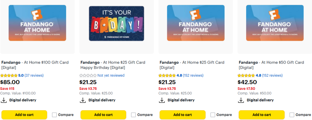 - Save 15% on select Fandango at Home gift cards [$100, $50, $25]