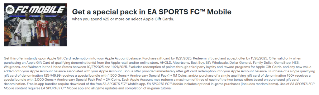 - Bonus offer provided immediately after gift card redemption into your Apple Account balance