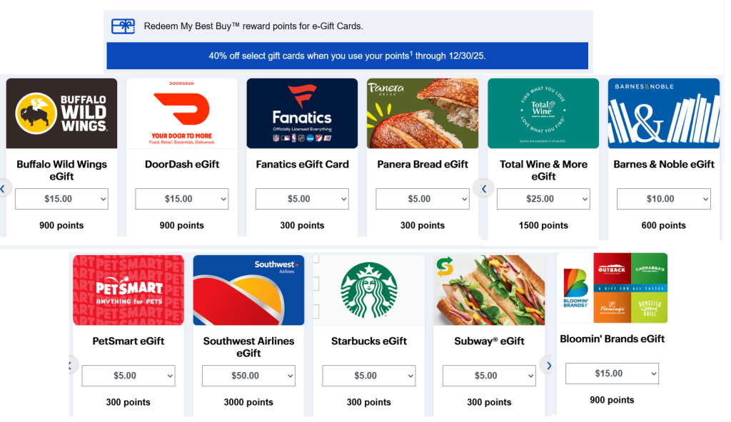 Redeem My Best Buy reward points for e-gift cards to select merchants for 40% fewer points through 12/30/25. Merchants include: