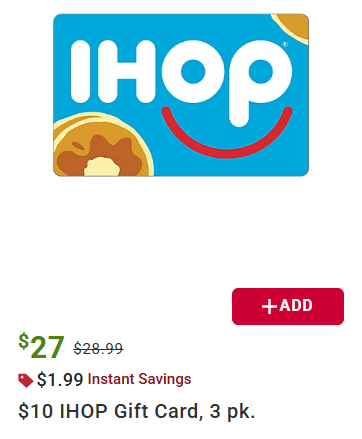 - $10 IHOP Gift Card, 3 pk. for $27 (reg, BJ’s price: $28.99)