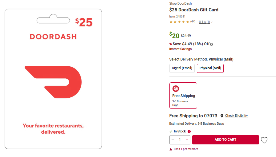 - $25 DoorDash Gift Card (physical) for $20 (20% off) instead of regular $23.99 (4% off)