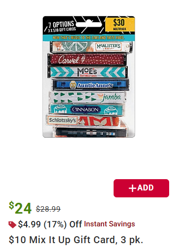 - $10 Mix It Up Gift Card, 3 pk. for $24 after $4.99 Instant Savings (reg. $28.99)