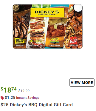 - $25 Dickey’s BBQ Digital Gift Card for $18.74, after $1.25 Instant Savings (~25% off) Reg $19.99