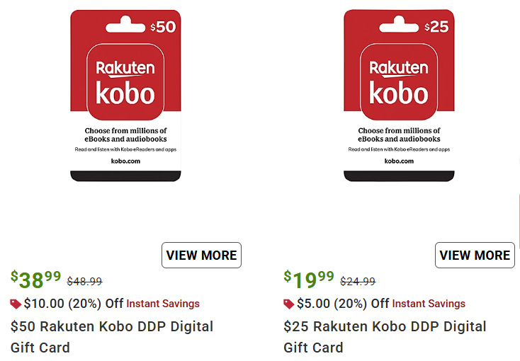 - $25 Rakuten Kobo DDP Digital Gift Card for $19.99 (Reg 24.99)