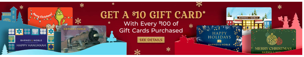 Get a $10.00 Barnes & Noble eGift Card with each purchase of $100.00 worth of Barnes & Noble Gift Cards or Barnes & Noble eGift Cards on Barnes & Noble.com in a single transaction only at Barnes & Noble.com