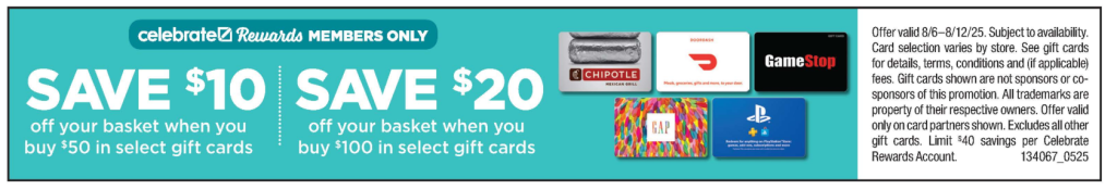 Save $10/$20 off you basket when you buy $50/$100 in the following gift cards: