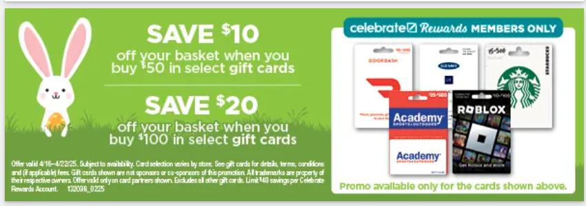 Save $10/$20 off you basket when you buy $50/$100 in the following gift cards: