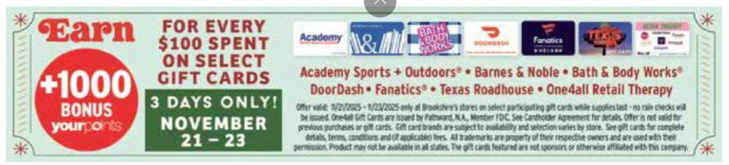 [EXPIRED] Brookshire’s: Buy Academy, Barnes & Noble, Bath & Body Works, DoorDash, Fanatics, Texas Roadhouse or Retail Therapy Gift Card and Get 1000 Bonus YourPoints for Every $100 Spent