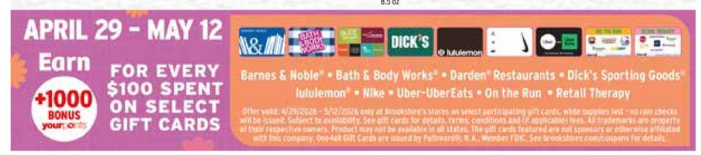 Brookshire’s: Buy Barnes & Noble, Bath & Body Works, Darden, Dick’s, Lululemon, Nike, Uber, On The Run or Retail Therapy and Get 1000 Bonus YourPoints for Every $100 Spent