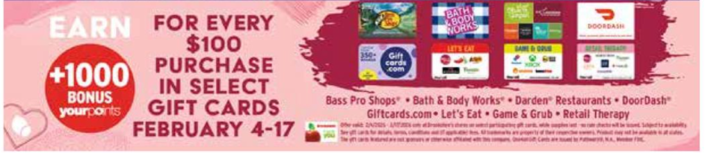 [EXPIRED] Brookshire’s: Buy Bass Pro Shops, Bath & Body Works, Darden, DoorDash, Giftcards.com, Let’s Eat, Game & Grub or Retail Therapy Gift Cards and Get 1000 Bonus YourPoints for Every $100 Spent