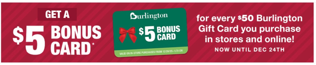 Get a $5 bonus card for every $50 Burlington gift card you purchase