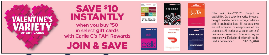 Save $10 instantly when you buy $50 in the following gift cards: