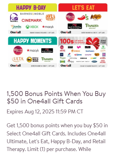 Get 1,500 bonus points when you buy $50 in One4all gift cards, including One4all Ultimate, Let’s Eat, Happy B-Day, and Retail Therapy.