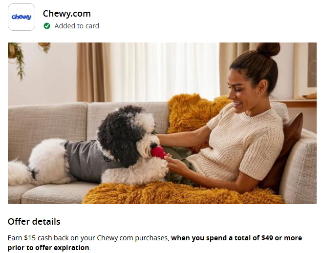 Targeted Chase Offer: Earn $15 cash back on your Chewy.com purchases, when you spend a total of $49 or more prior to offer expiration.
