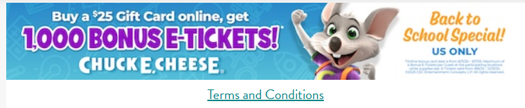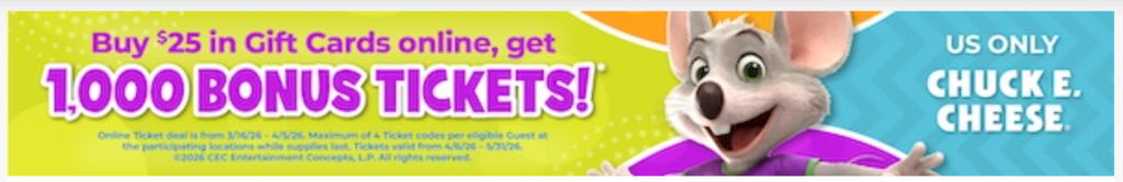 Buy a $25 in Chuck E. Cheese gift cards online, get 1000 bonus e-tickets!