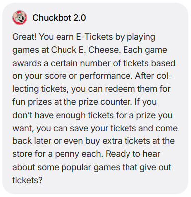 As per Chuckbot 2.0, e-tickets can be redeemed for prizes at the counter and can be bought for a penny each.