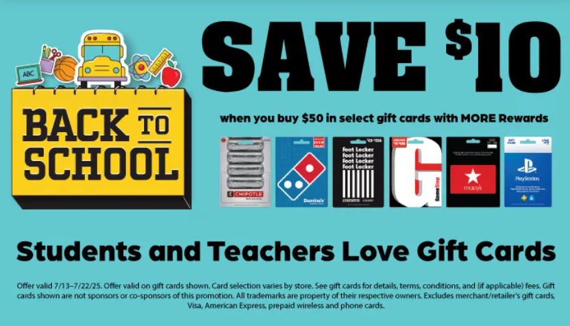 Save $10 when you buy $50 in the following gift cards with More Rewards:
