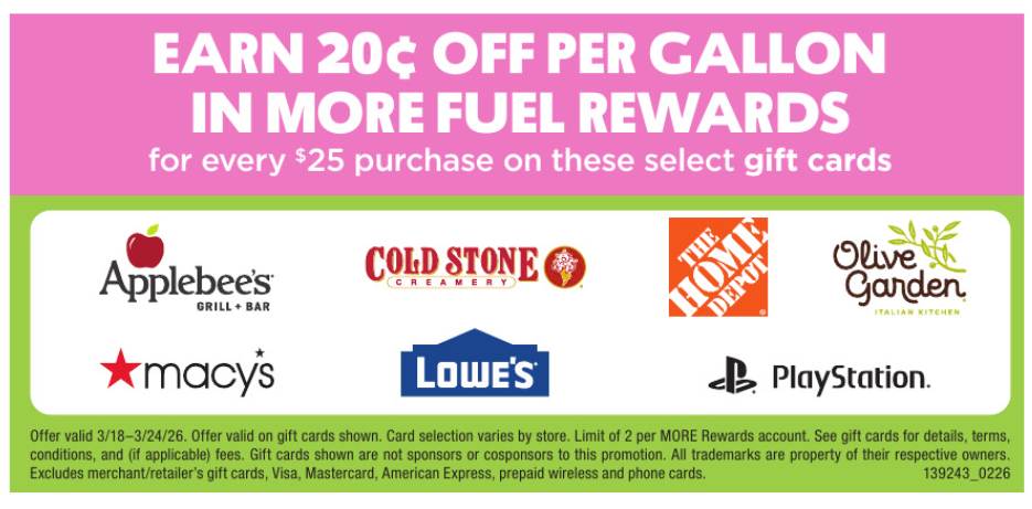 Coborn’s: Buy $25 Applebee’s, Cold Stone Creamery, Home Depot, Olive Garden, Macy’s, Lowe’s or PlayStation Gift Cards and Get 20c Off Per Gallon in More Fuel Rewards