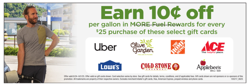 Purchase $25 in the following gift cards and save 25c per gallon in fuel: