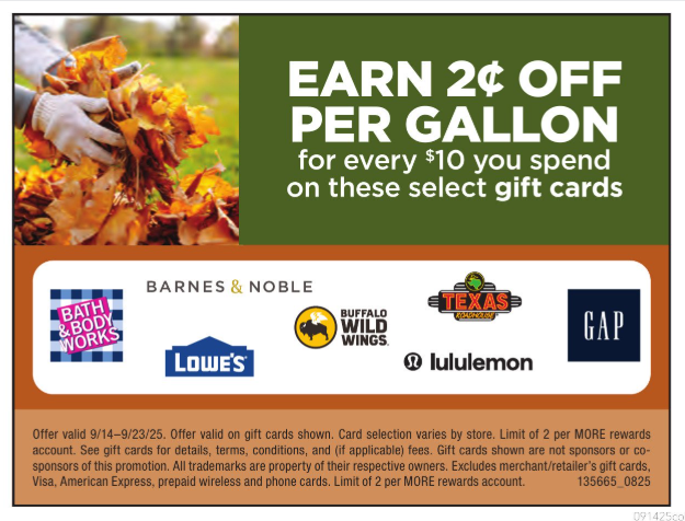 Earn 2c off per gallon for every $10 spent on the following gift cards: