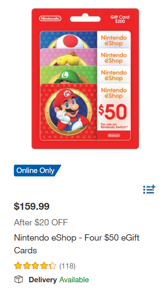 - Nintendo eShop – Four $50 eGift Cards for $159.99 after $20 manufacturer’s savings (reg $179.99)