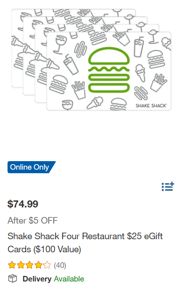 - Shake Shack Four Restaurant $25 eGift Cards ($100 Value) – for $74.99 (reg. $79.99)