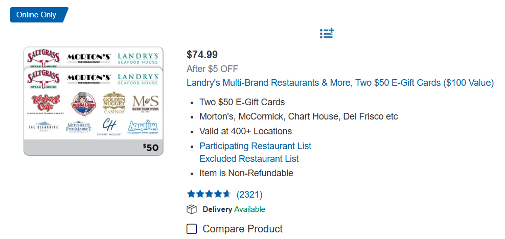 - Landry’s Multi-Brand Restaurants & More, Two $50 E-Gift Cards ($100 Value) – for $74.99 (reg. $79.99), online only