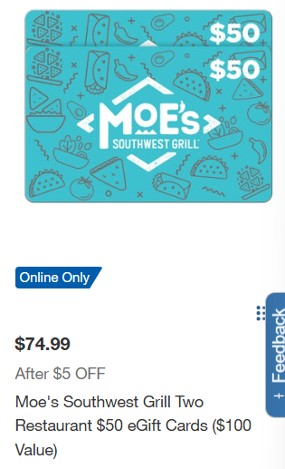 - Moe’s Southwest Grill Two Restaurant $50 eGift Cards ($100 Value) – for $74.99 (reg. $79.99)