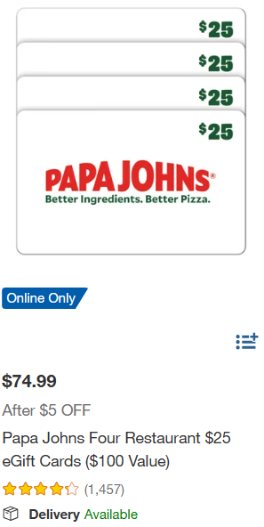 - Papa Johns Four Restaurant $25 eGift Cards ($100 Value) for $74.99 (reg. $79.99)