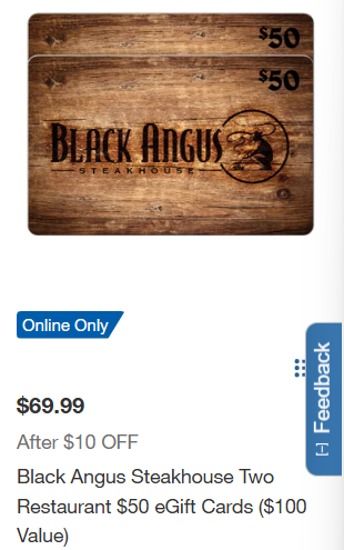 - Black Angus Steakhouse Two Restaurant $50 eGift Cards ($100 Value) – for $69.99 (reg. $79.99)