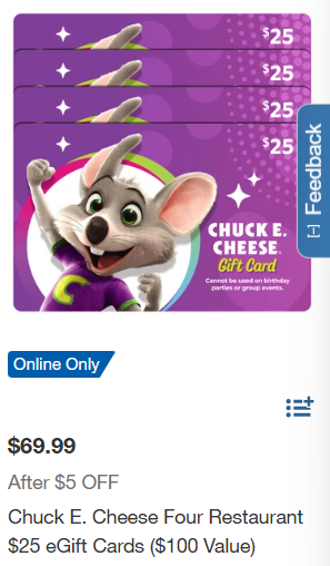 - Chuck E. Cheese Four Restaurant $25 E-Gift Cards ($100 Value) – for $69.99 (reg. $74.99)