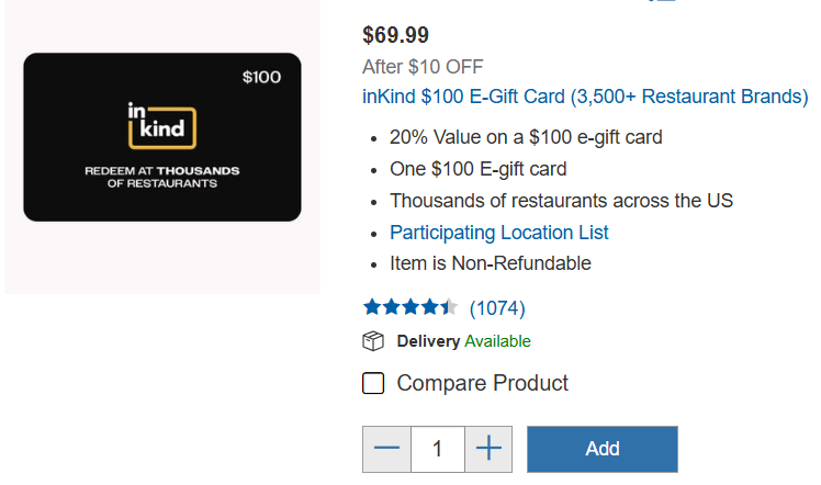 - inKind $100 E-Gift Card (1,500+ Restaurant Brands) – for $69.99 (reg. $79.99)