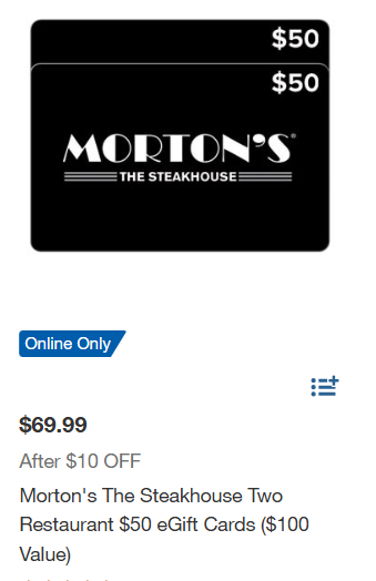 - Morton’s The Steakhouse Two Restaurant $50 E-Gift Cards ($100 Value) – for $69.99 (reg. $79.99), online only