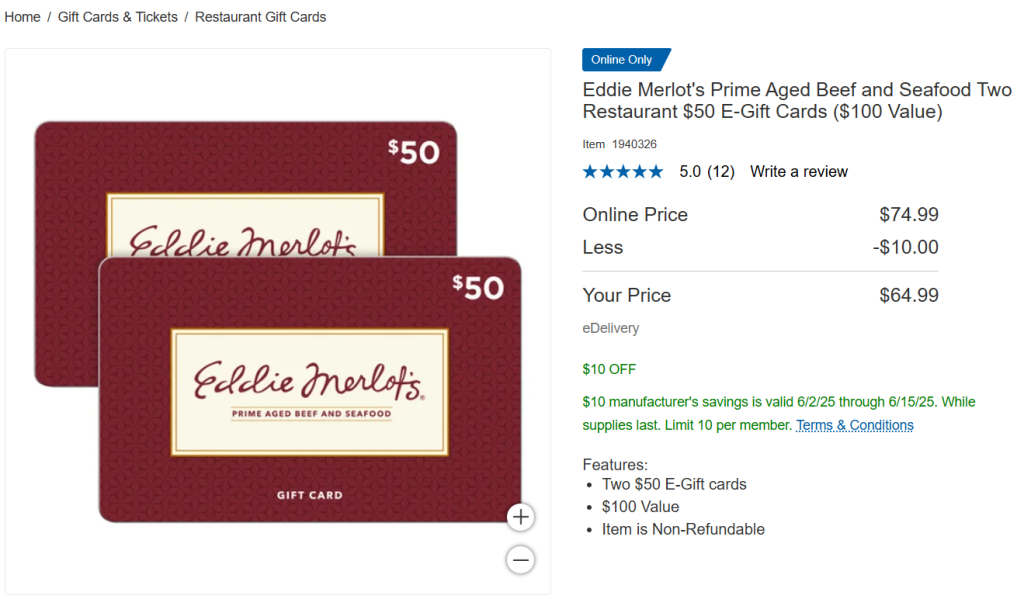 - Eddie Merlot’s Prime Aged Beef and Seafood Two Restaurant $50 E-Gift Cards ($100 Value) – for $64.99 (reg. $74.99)