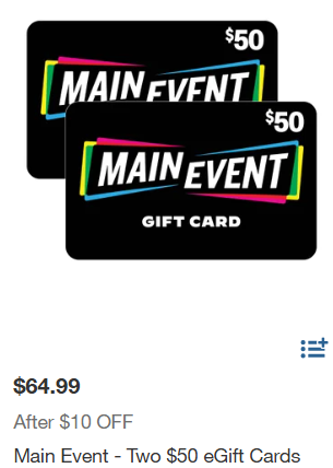 - Main Event – Two $50 eGift Cards – for $64.99 (reg. $74.99) after $10 manufacturer’s savings