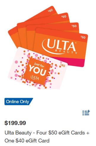 Ulta Beauty – Four $50 eGift Cards + One $40 eGift Card for $199.99. Included are Four $50 eGift Cards and One bonus $40 eGift Card.