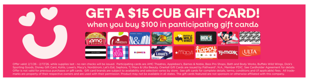 Cub: Buy $100 AMC, Applebee’s, Barnes & Noble, Bass Pro Shops, Buffalo Wild Wings, Dick’s, Disney, Nordstrom, Sephora, Bath & Body Works, Kohl’s, Macy’s, Lowe’s, Let’s Eat, TJ Maxx or Ulta Gift Cards and Get $15 Cub Gift Card Free