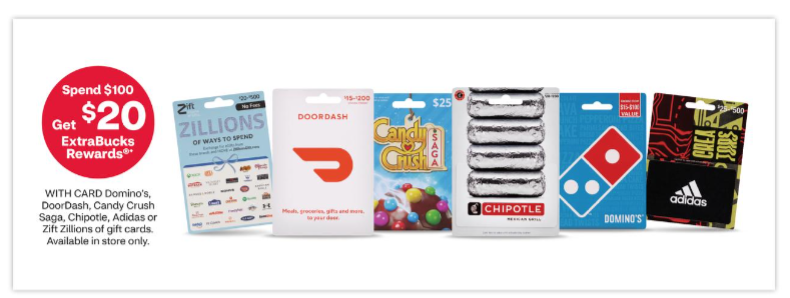 Spend $100 on the following gift cards and get $20 ExtraBucks Rewards with card: