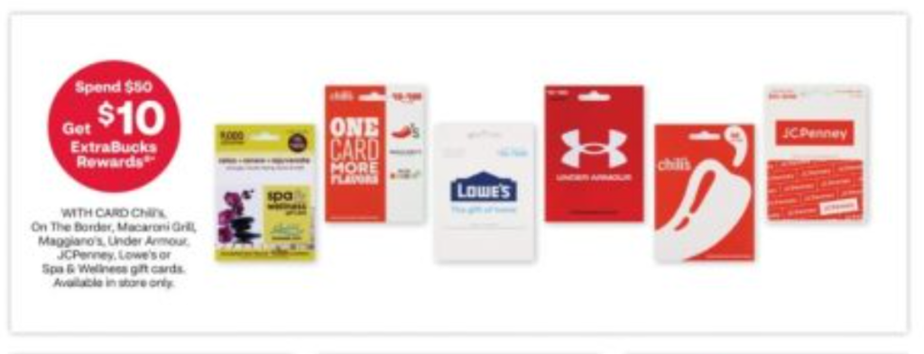 Spend $50 on the following gift cards and get $10 ExtraBucks Rewards with card: