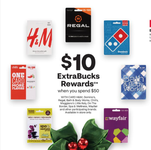 Spend $50 on the following gift cards and get $10 ExtraBucks Rewards with card: